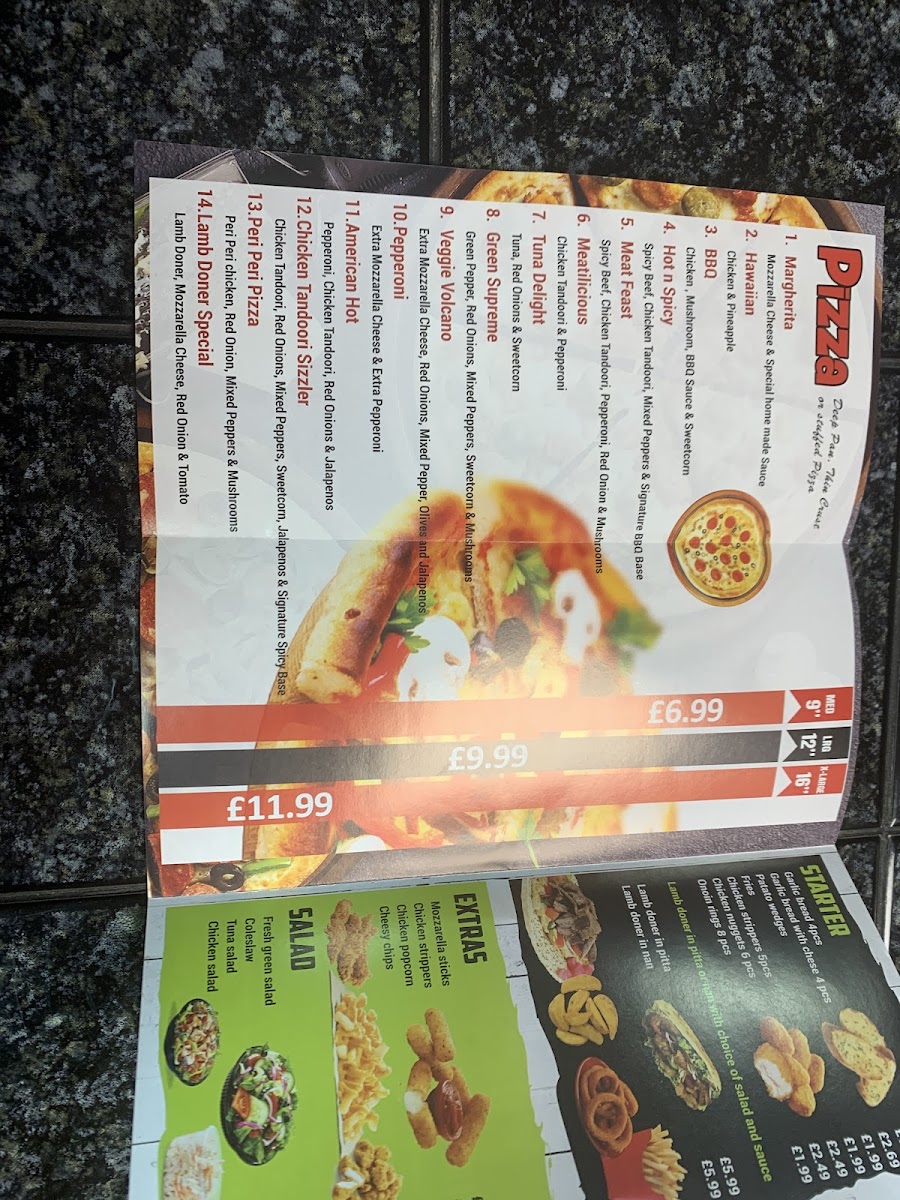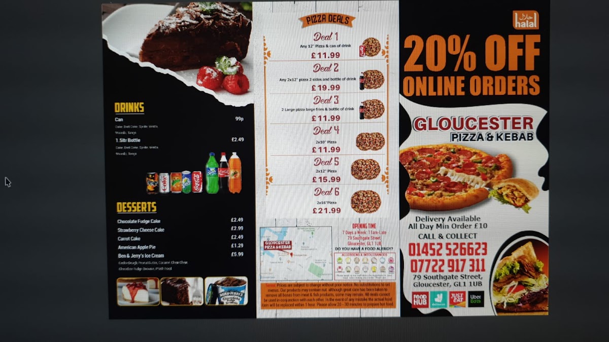 The menu at Gloucester Pizza & Kebab offers a delightful mix of traditional and tempting options that are sure to satisfy a variety of tastes. For starters, customers can enjoy Garlic Bread (4pcs) or opt for the enhanced Garlic Bread with Cheese (4pcs). If you're in the mood for something a little more substantial, the Chicken Strippers (5pcs) or Potato Wedges Fries make for a satisfying choice. The extras include indulgent options like Mozzarella Sticks, Cheesy Chips, and more Chicken Strippers and Chicken Popcorn. For those who prefer a fresh touch, the salad selection includes Fresh Green Salad, Coleslaw, Tuna Salad, and Chicken Salad. Pizza lovers will find their fix in the Margherita, Hawaiian, BBQ, Hot N Spicy, and Meat Feast options, as well as great value with the Pizza Deals (Deal 1, Deal 2, Deal 3). For a sweet finish, the desserts menu features classics like Chocolate Fudge Cake, Strawberry Cheesecake, American Apple Pie, and the popular Ben & Jerry’s Ice Cream. Whether you're craving a pizza, a snack, or a dessert, Gloucester Pizza & Kebab offers a satisfying range of dishes to enjoy.